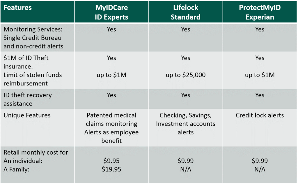 As a unique feature, IDexperts provides medical identity case monitoring. Other companies, like LifeLock, will monitor your savings and investment accounts. Experian, as an example, will set up a credit lock, or a credit freeze on your credit.